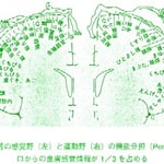 皆さん、食べるときのことを思い浮かべてみて下さい。食べ物を口に入れる前に、まず目(視覚)で食べ物がどのような状態であるかを判断します。目と鼻での関門を越えて口に入った食べ物は、歯で噛み砕かれます。そこで感じるのは、味覚による食べ物の味や体性感覚(触覚や温度感覚など)による食べ物の温度や硬さや滑らかさ、嗅覚による香りなどです。そして、耳(聴覚)では、食べ物を噛む音を感じます。つまり、五感をフル回転させて、食べ物からいろいろな情報を感じとっているのです。lさらに、噛むことで食べ物が壊れて、味や匂いを強く感じることが出来、歯ざわりや噛みごたえなども、噛んでこそわかることです。図は、Penfieldによる脳の機能分担を示したものです。これは、体内の皮膚感覚が、脳のどの部分を刺激しているのかを表しています。上唇から咽頭まで、口に関連した部分の情報が、全体の約三分の一を占めていることがわかります。脳での分担量は、その器官の大きさに対応しているのではなく、感覚情報の重要さに対応しています。口の大きさは体全体から見れば小さいものですが、口での食感や温度感覚が、人間にとっていかに大切なのかがわかります。